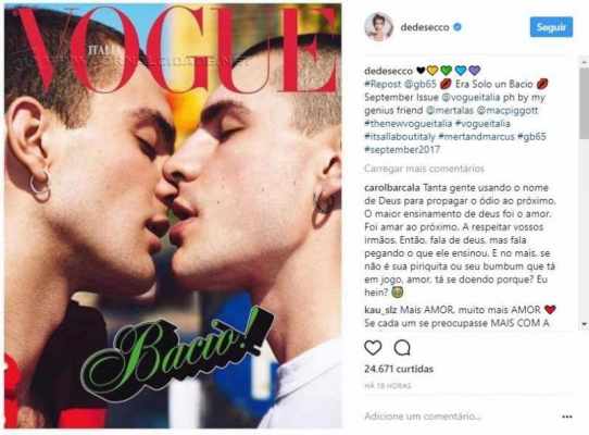 A atriz Deborah Secco repudiou mensagens homofóbicas que recebeu após compartilhar a capa da última edição italiana da revista Vogue, em que dois homens aparecem se beijando.