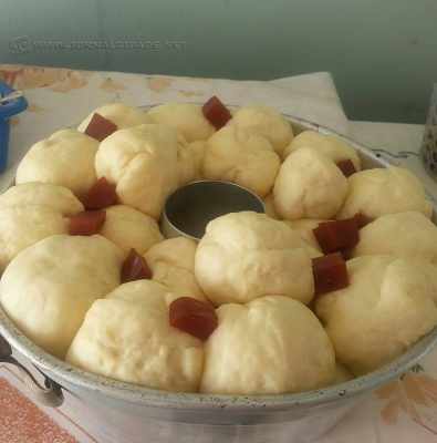 Bata no liquidificador os ovos, o fermento, o óleo e o iogurte (ou o leite); despeje em uma tigela e acrescente o trigo, o sal e o açúcar e amasse muito bem. Caso seja necessário, coloque mais trigo. Faça pequenas bolinhas com a massa e coloque no meio delas pedaços de goiabada cascão; depois as deposite em uma forma redonda com buraco no meio.