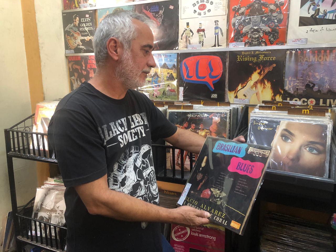 Quem também é um apreciador do disco de vinil é Jhonny Ferreira, 58 anos. Há mais de três décadas ele é proprietário da loja Outras Histórias Sebo & Gibiteria, localizada na Rua 6 nº 1337, que reúne a cultura através da música, livros e quadrinhos. No local tem quase 2 mil discos de vinil, uma paixão que começou ainda criança: “O primeiro disco que eu ouvi eu tinha uns seis anos de idade. Não era nem LP, era aquele 78 rotações do Elvis Presley. Um disco um pouco menor, de 10 polegadas. Era girava em uma rotação maior e tinha uma música de cada lado”, conta.