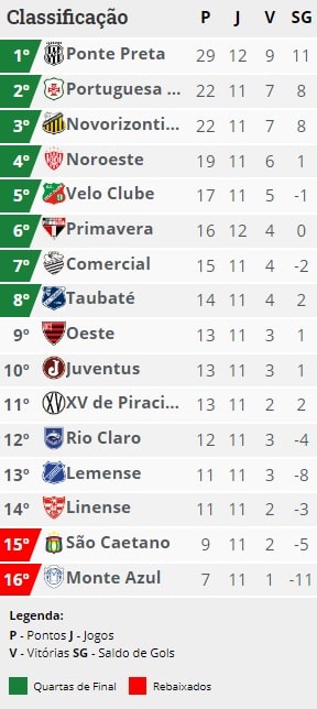 Três equipes seguem com mais tranquilidade e bem próximas da classificação no estadual. Ponte Preta, líder com 29 pontos, Portuguesa Santista vice-líder e o Novorizontino na terceira posição com 22 pontos.