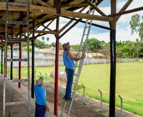 As obras no estádio incluíram nova cobertura para a arquibancada, gramado, reforma dos vestiários e pintura. “Também construímos dois sanitários para o público”, informa o secretário municipal de Obras, Rodrigo Mussio.