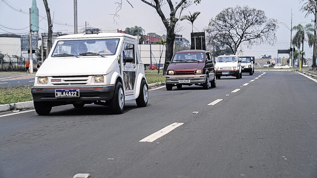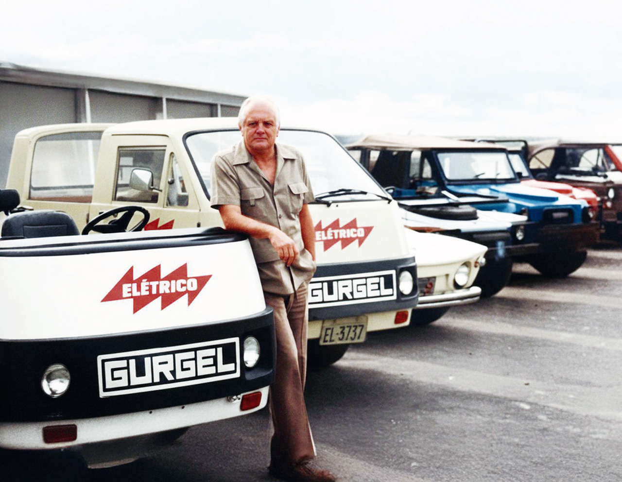 O fundador João Gurgel posa com a linha de veículos que marcou uma era da indústria automotiva brasileira