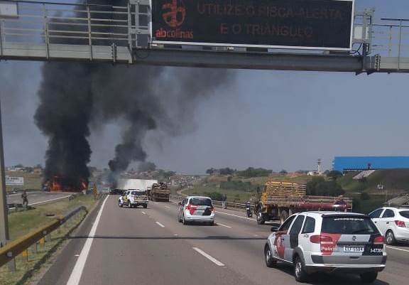 Os criminosos interditaram as faixas da Rodovia Santos Dumont ateando fogo em caminhões, o que impediu o fluxo de veículos no local.