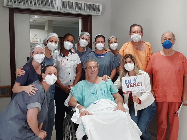 Uma foto que circula nas redes sociais mostra o médico rodeado por colegas de trabalho após ter alta UTI. Nos comentários amigos comemoraram a alta do profissional e desejaram uma rápida recuperação.