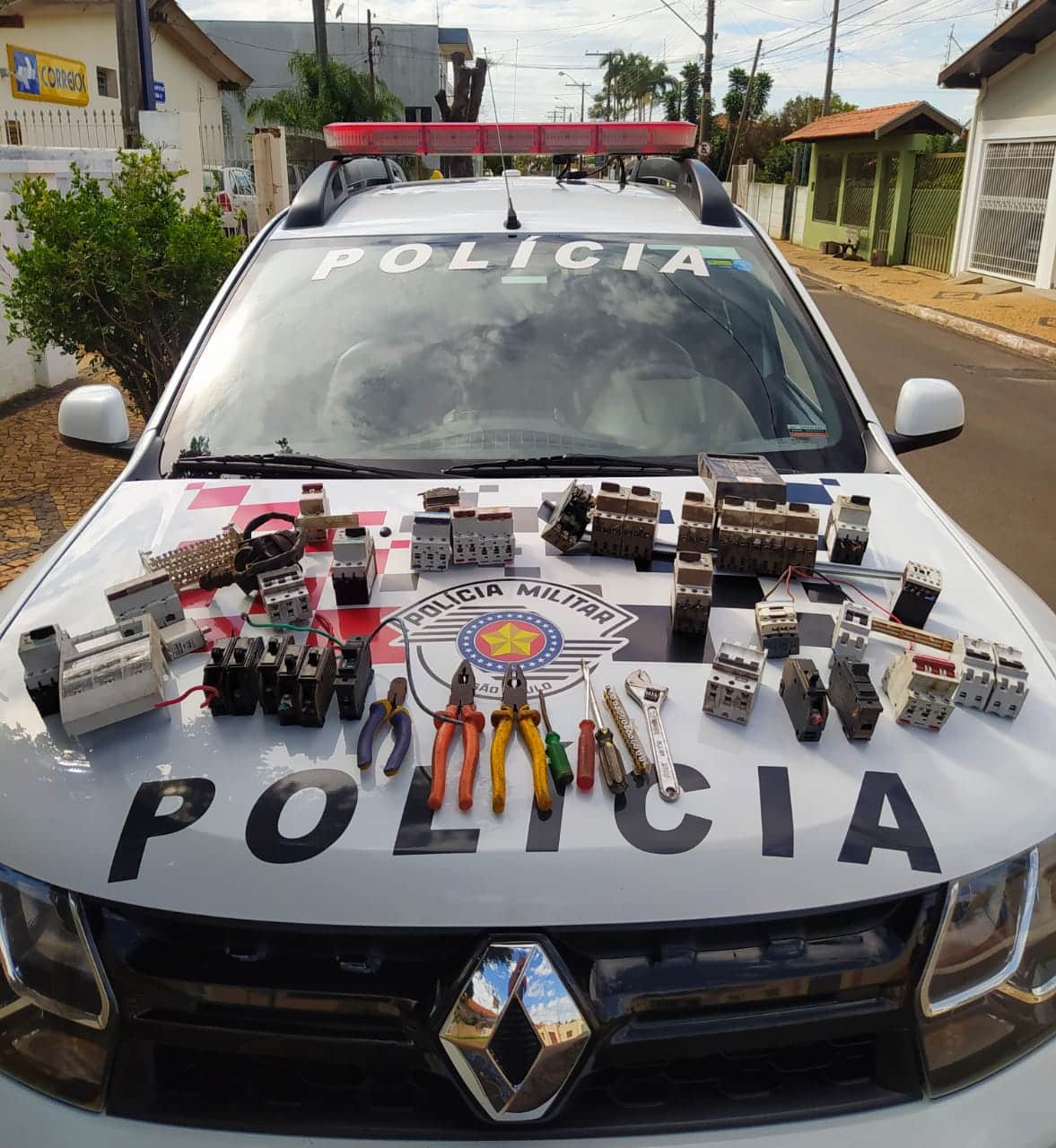 Uma dupla foi abordada furtando fios de cobre, disjuntores e um ar condicionado. Foi realizada busca pessoal onde foi localizado as ferramentas utilizadas no furto e um celular.