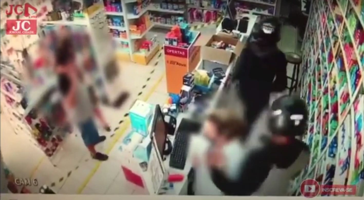 Nas imagens é possível ver que a funcionária da farmácia atende um casal, quando é surpreendida pelos indivíduos que abrem o caixa e subtraem a quantia de R$800,00, a sua aliança, alguns medicamentos e o celular do gerente.