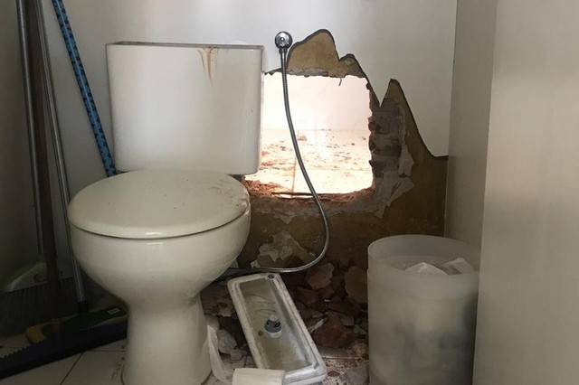 De acordo com informações da Polícia Civil, os bandidos fizeram um buraco entre um imóvel vizinho e o depósito do comércio e entraram pelo teto do banheiro, onde retiraram o vaso sanitário.