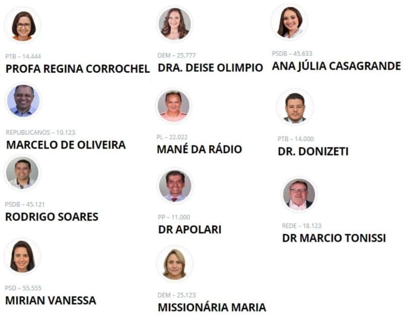 A parlamentar mais votada neste pleito foi a Profª Regina Noêmia Geromel Corrochel (PTB) com 2.216 votos, seguida por Marcelo de Oliveira (Republicanos) com 1.801 votos, Rodrigo Soares (PSDB) com 1.647, Miriam Vanessa (PSD) com 1.568, Dra. Deise Olimpio (DEM) 1.564, Mané da Rádio (PL) eleito pela primeira vez com 1.313 votos, Dr. Apolari (PP) 1.197 votos, Missionária Maria (DEM) 1.051, Ana Júlia Casagrande (PSDB) com 881 votos, Dr. Donizeti (PTB) com 862 votos e Dr. Márcio Tonissi (REDE) com 796 votos.