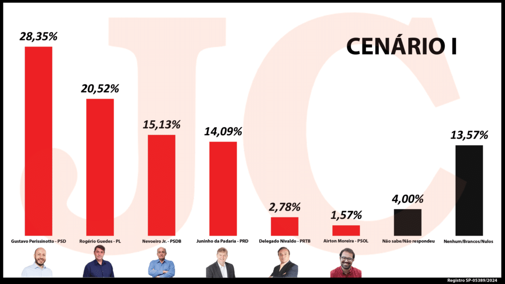 O primeiro cenário estimulado pesquisado pelo JC/Statsol tem o prefeito Gustavo Perissinotto (PSD) em destaque nas intenções de voto do eleitorado rio-clarense. O mandatário está com 28,35% da preferência entre os entrevistados. O vice-prefeito Rogério Guedes (PL), pré-candidato em oposição ao atual chefe do Poder Executivo, cresce na tabela com 20,52%.