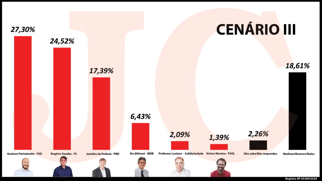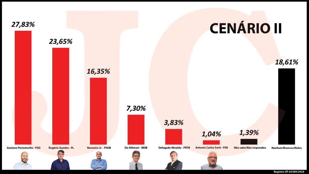 O ex-prefeito Du Altimari (MDB) foi testado neste cenário e tem 7,30% das intenções. Delegado Nivaldo (PRTB) com 3,83% da preferência e Antonio Carlos Sarti (PSB) com 1,04% completam a tabela. Curiosamente, ainda sem Juninho neste levantamento, o número daqueles que já estão decididos a votar em branco/nulo aumenta de 13,57% no Cenário 1 para 18,61% neste novo. Os indecisos que não sabem em quem votar chegam a 1,39%.