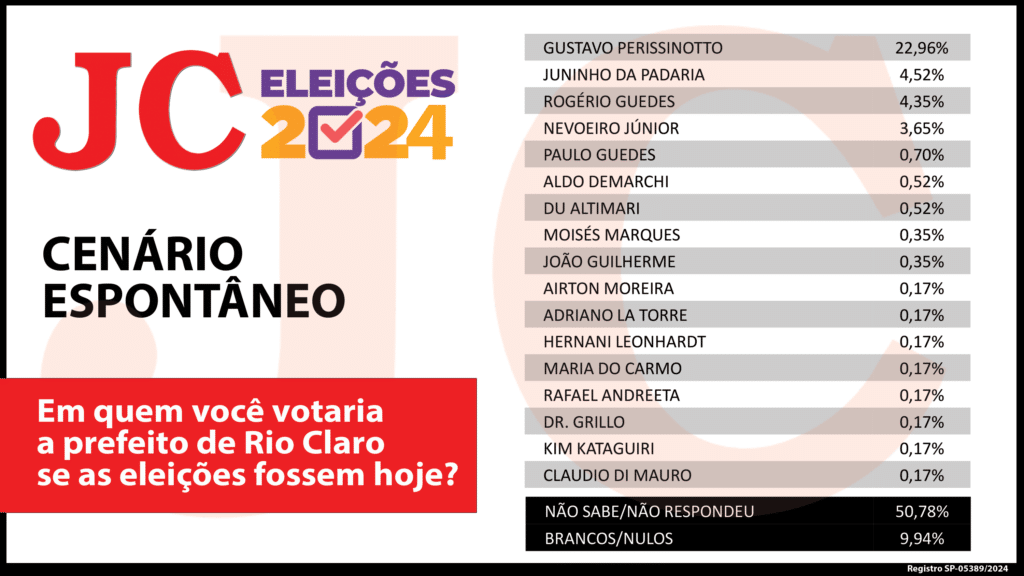 O Jornal Cidade traz na edição deste domingo (19) a primeira pesquisa de intenção de voto a prefeito de Rio Claro em 2024. As eleições acontecem em outubro, e pelo resultado do levantamento espontâneo encomendado pelo Grupo JC à empresa de estatística Statsol, o retrato do momento é que entre os entrevistados, aqueles que já sabem em quem depositarão seu voto demonstraram preferência até agora pela continuidade dos trabalhos do atual prefeito Gustavo Perissinotto (PSD), que aparece com 22,96% da opinião pública.