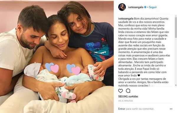 A cantora Ivete Sangalo compartilhou com os fãs um momento em família: a cantora publicou no Instagram uma foto em que aparece amamentando as gêmeas recém-nascidas Helena e Marina, enquanto é abraçada pelo marido e pelo filho mais velho, Marcelo.