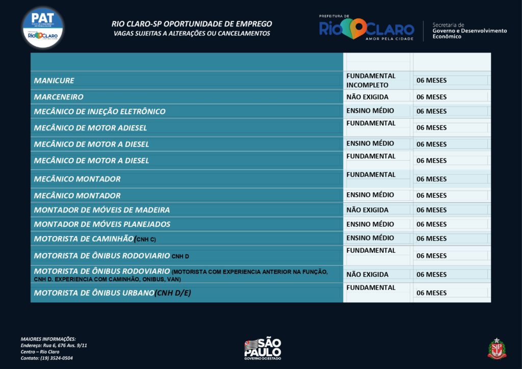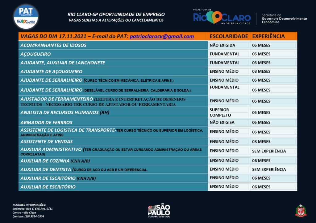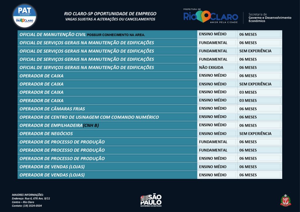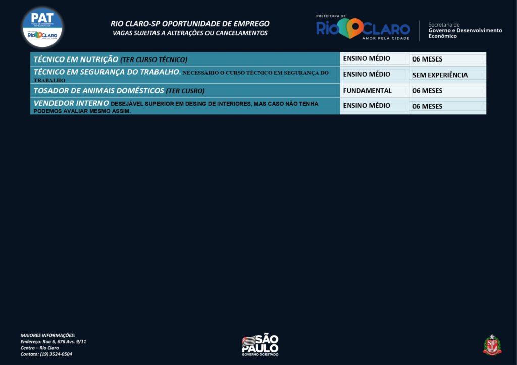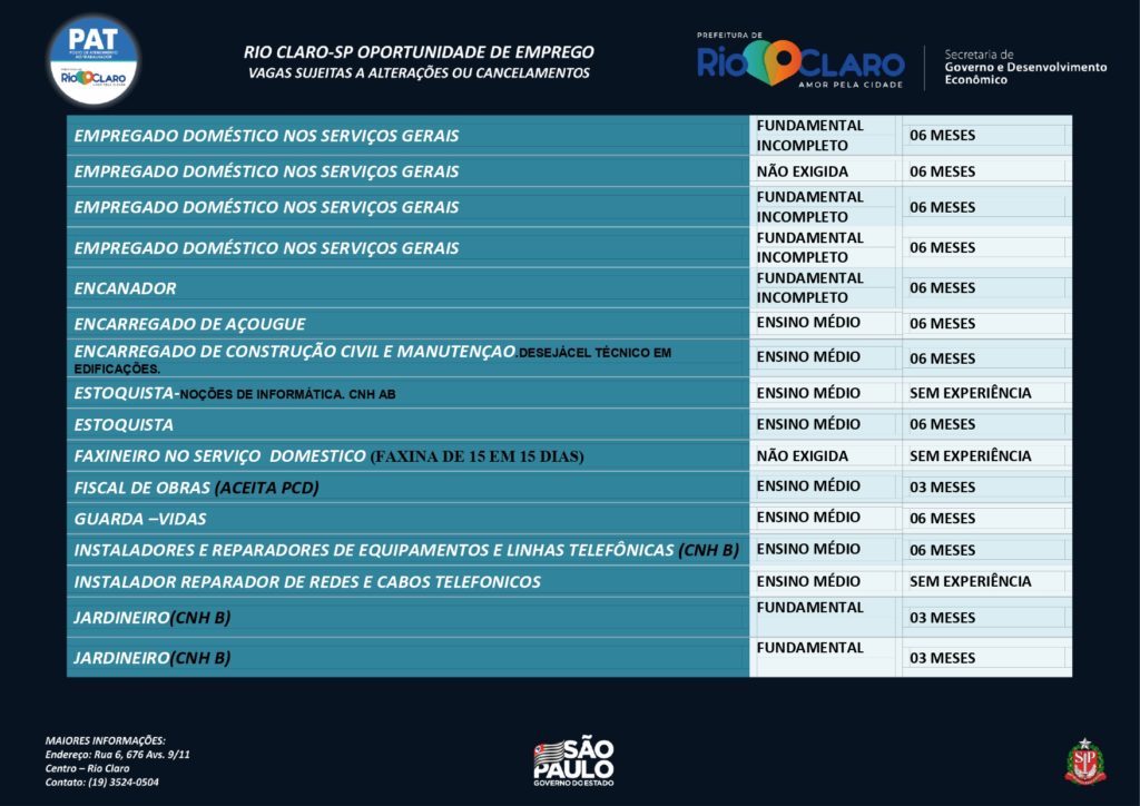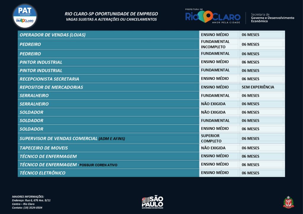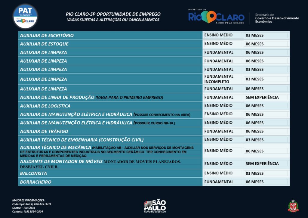 O PAT de Rio Claro está com diversas vagas abertas nesta quarta-feira (17). Para mais informações sobre as vagas e exigências, o número do PAT é o (19) 3524-0504. O e-mail para contato é [email protected], pelo qual você pode enviar o seu currículo. O PAT fica localizado na Rua 6, n°676, entre as Avenidas 9 e 11, no Centro. Confira as vagas de hoje:
