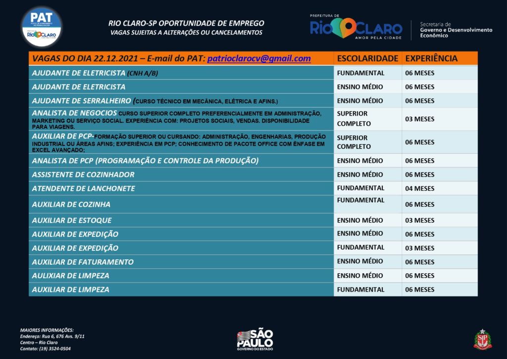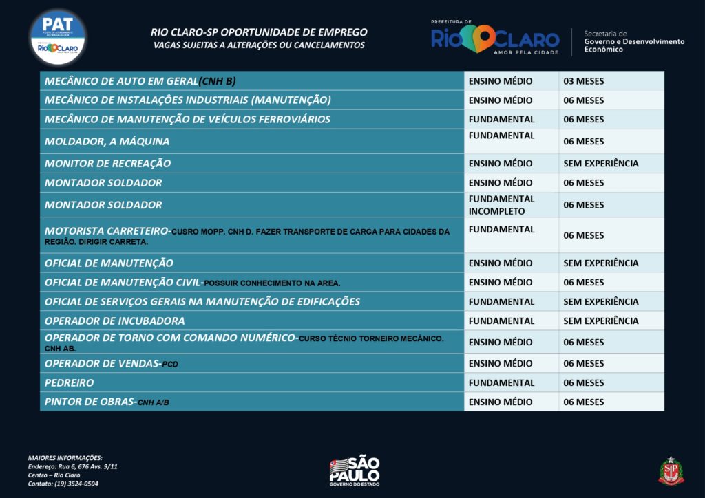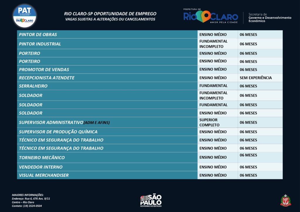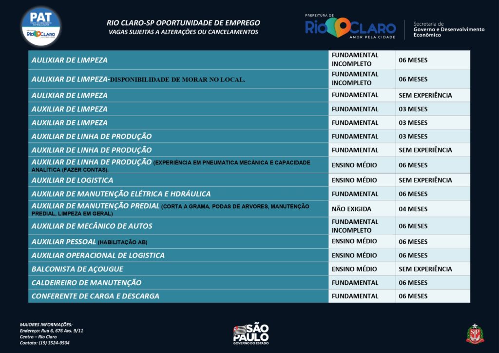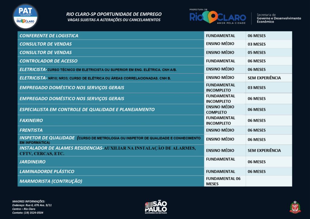 O PAT de Rio Claro está com diversas vagas abertas nesta quarta-feira (22). Para mais informações sobre as vagas e exigências, o número do PAT é o (19) 3524-0504. O e-mail para contato é [email protected], pelo qual você pode enviar o seu currículo. O PAT fica localizado na Rua 6, n°676, entre as Avenidas 9 e 11, no Centro. Confira as vagas de hoje: