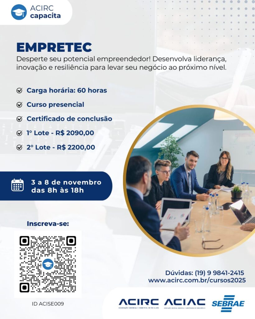 O Empretec é o principal programa de formação de empreendedores do mundo, desenvolvido pela Organização das Nações Unidas (ONU) e aplicado exclusivamente pelo SEBRAE no Brasil. Uma imersão transformadora de 6 dias para desenvolver o comportamento empreendedor, identificar oportunidades, melhorar sua performance nos negócios e maximizar seus resultados com foco, planejamento e execução.