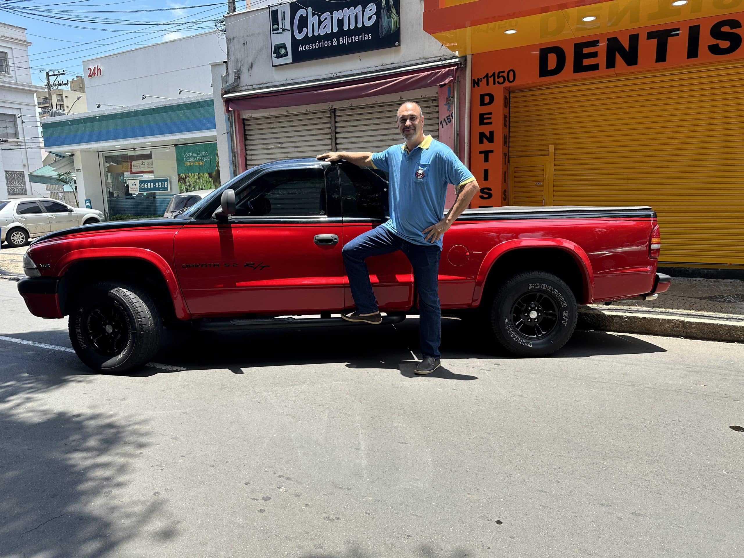 Luciano Baroni levou o ‘brinquedinho da família’, uma caminhonete não muito antiga. A Dodge Dakota vermelha R/T 5.2 V8 tem pneu aro 15 e apenas vinte e quatro anos de fabricação. “Ela foi customizada, na verdade desde a sua fabricação foi feita uma personalização da sua pintura, segue com a mecânica original, mas tem um sistema de escape diferenciado, importado MagnaFlow, adquiri há alguns anos, bem íntegra, bem nova, e é um xodó meu e dos meus filhos”.