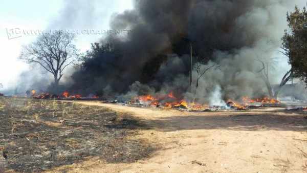 Equipes do Corpo de Bombeiros e da Defesa Civil de Rio Claro trabalham para combater as chamas em um depósito de materiais recicláveis localizado na estrada que liga Rio Claro a Ajapi.