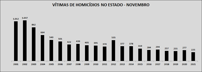 As mortes intencionais caíram 12,8% no mês passado, em comparação com o décimo primeiro mês de 2020. O número passou de 243 para 212. A quantidade de vítimas desse crime seguiu a tendência e apresentou recuo de 18,8% no período – passando de 277 para 225. Em ambas as situações, os resultados são os menores da série histórica, iniciada em 2001.