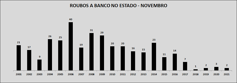 Na comparação mensal, o índice de roubo a banco caiu de três para dois e atingiu o segundo menor total da série histórica.