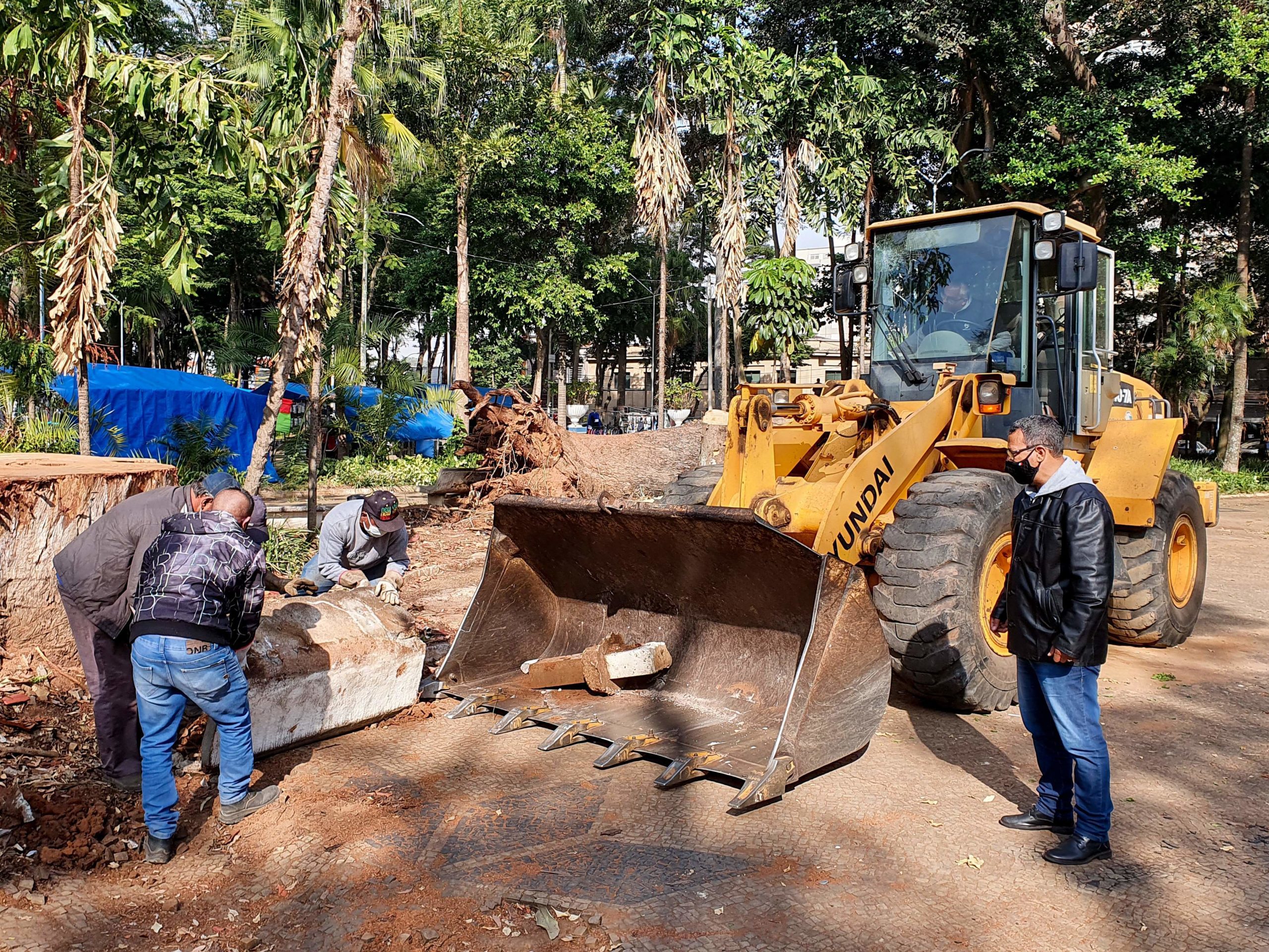 Nesta quarta-feira (19), equipe da prefeitura realizou a remoção de restos de bancos de cimento que também foram danificados na queda da árvore. A prefeitura fará ainda a recomposição do piso que é de pedra portuguesa.