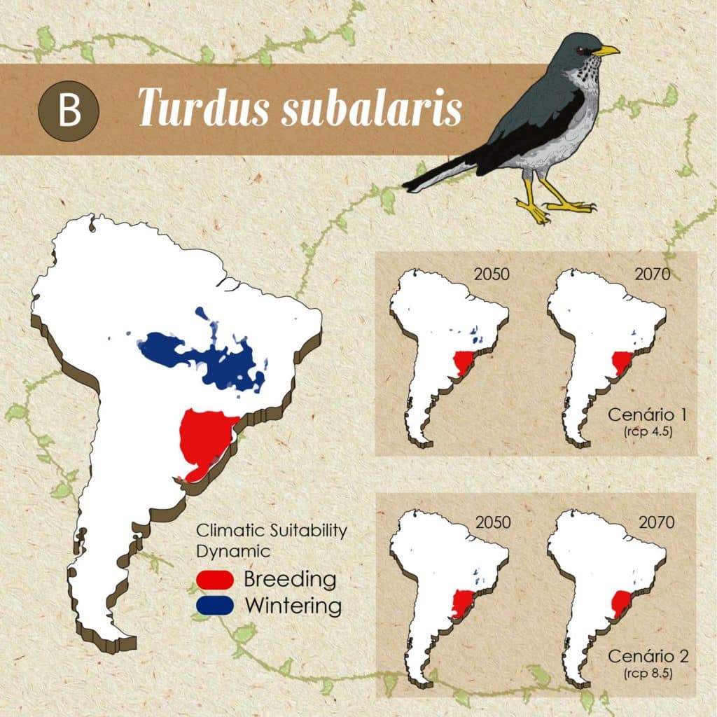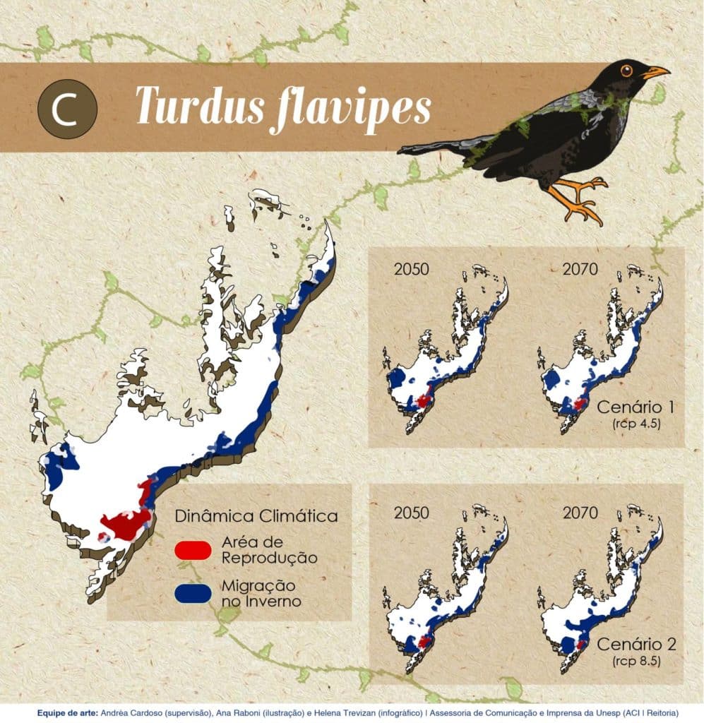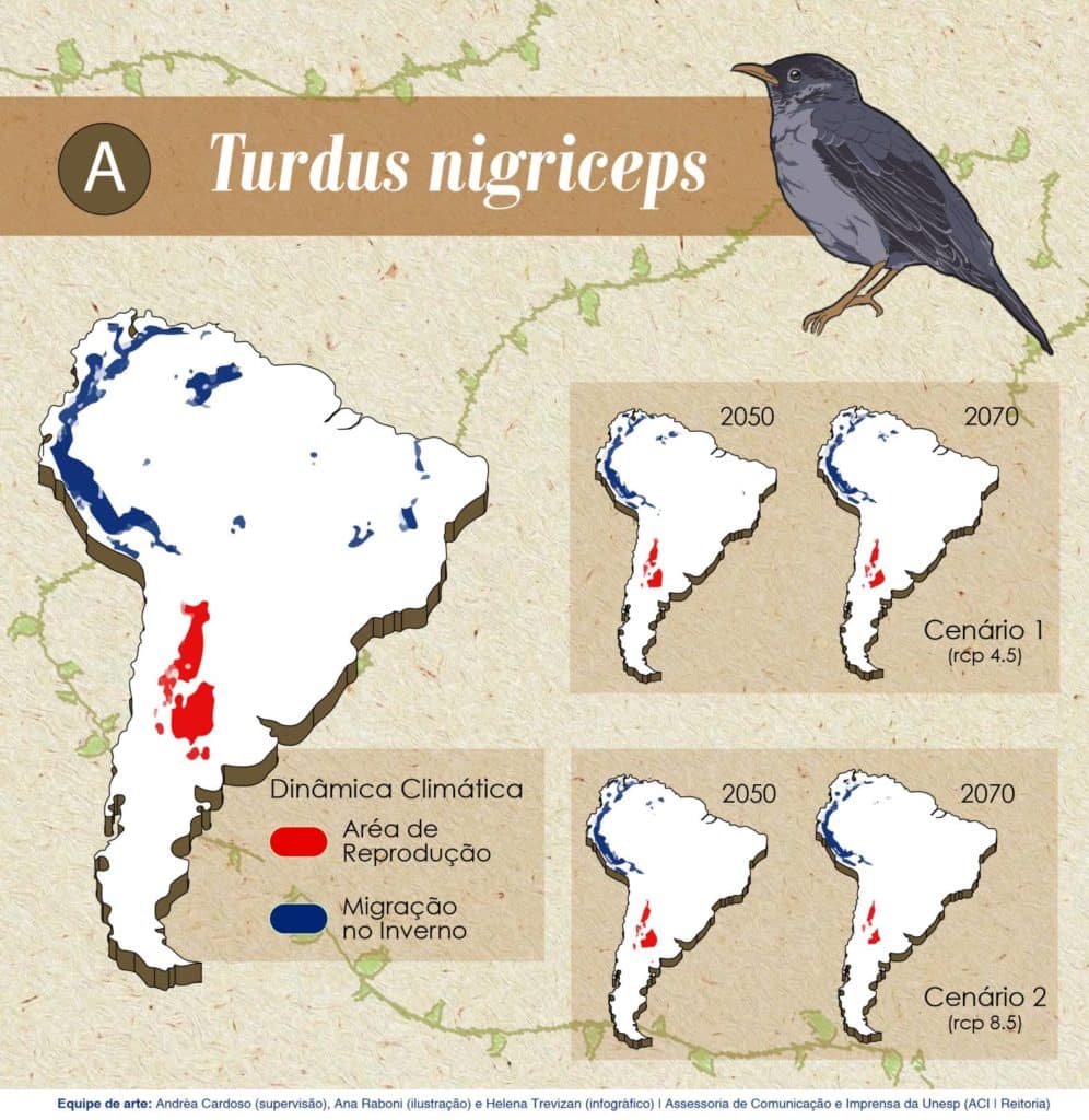 A pesquisa coletou dados de ocorrência dessas espécies por meio de ciência cidadã, museus e artigos científicos, associando modelos de nicho ecológico e simulações climáticas para predizer modificações futuras nas áreas de reprodução e de invernada do sabiá andino, ou Turdus nigriceps, que migra latitudinalmente e em altitude na Cordilheira dos Andes; do sabiá ferreiro, ou Turdus subalaris, que migra latitudinalmente na Mata Atlântica; e do sabiá-una, ou Turdus flavipes, que migra em altitude na Mata Atlântica.