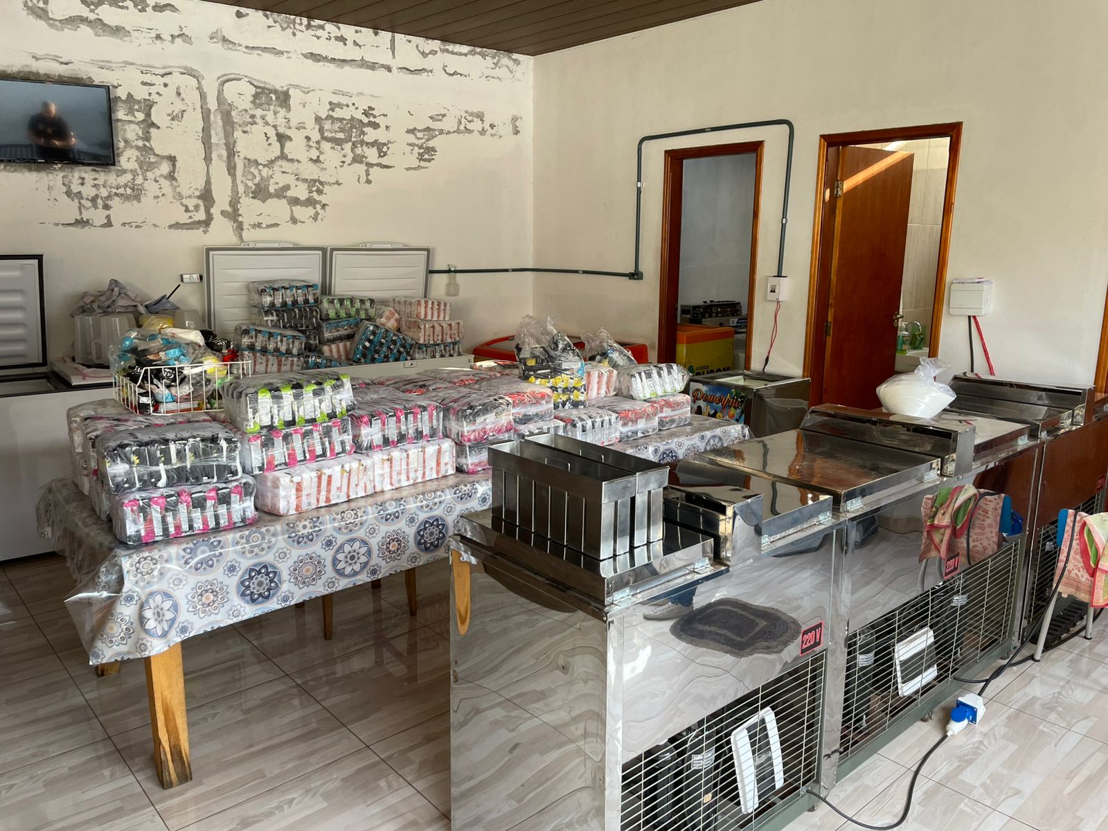 O local não possuía registro como pessoa jurídica, tampouco autorização dos órgãos competentes para o exercício da atividade. Foram apreendidas 4.750 unidades de gelo saborizado (aproximadamente 902,5 kg), 18 pacotes de 5 kg de saborizante (90 kg), 44 pacotes de adoçante de 300 g (13,2 kg), 19.000 rótulos irregulares, três máquinas de congelamento, um bebedouro, sete freezers, duas seladoras e 18 formas de inox. Garrafas de bebidas alcoólicas e embalagens com indícios de reutilização irregular também foram encontradas na residência.