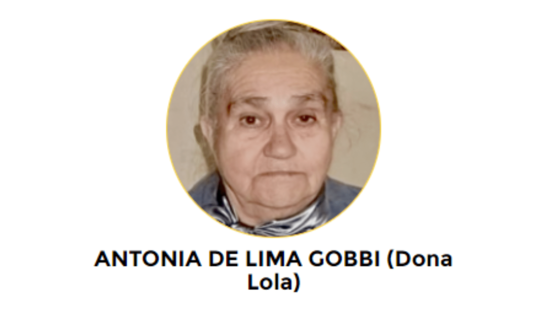 Antonia de Lima Gobbi, Dona Lola – 82 anos. Faleceu dia 17, às 20h37, em Itirapina. Era viúva de Alicio Gobbi, deixou os filhos Ademir c/c Sonia, Adenir c/c Mariangela, Antonia c/c Edison, Alicio conv/c Josiane, Ana c/c Laercio, Paulo, Patricia c/c Devanir, 10 netos e 8 bisnetos. Foi sepultada no Cemitério Municipal de Itirapina;