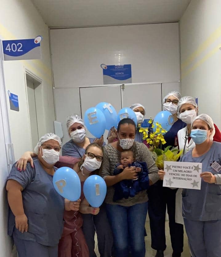 Começou então uma luta pela vida do bebê. Foram 182 dias de internação entre a UTI Neonatal e o berçário: “O Pietro foi muito importante para a nossa história da UTI Neonatal, porque foi um prematuro extremo que evoluiu com uma forma grave da prematuridade e muitas complicações. Ele teve que vencer muitas infecções, fez o uso de muitos antibióticos. Teve uma displasia broncopulmonar – que é um machucado no pulmão – devido à prematuridade e ao suporte ventilatório. Ele ficou no oxigênio por cinco meses e foi um vitorioso, porque teve que superar muitas etapas. Neste mês demos alta para ele, que foi para casa se alimentando de forma natural. Sem dúvida uma história que mexeu muito com todos nós e que teve o melhor desfecho possível”, comemorou a Drª Claudia Trevilatto Rossetti – médica responsável pela UTI Neonatal da Santa Casa de Rio Claro.