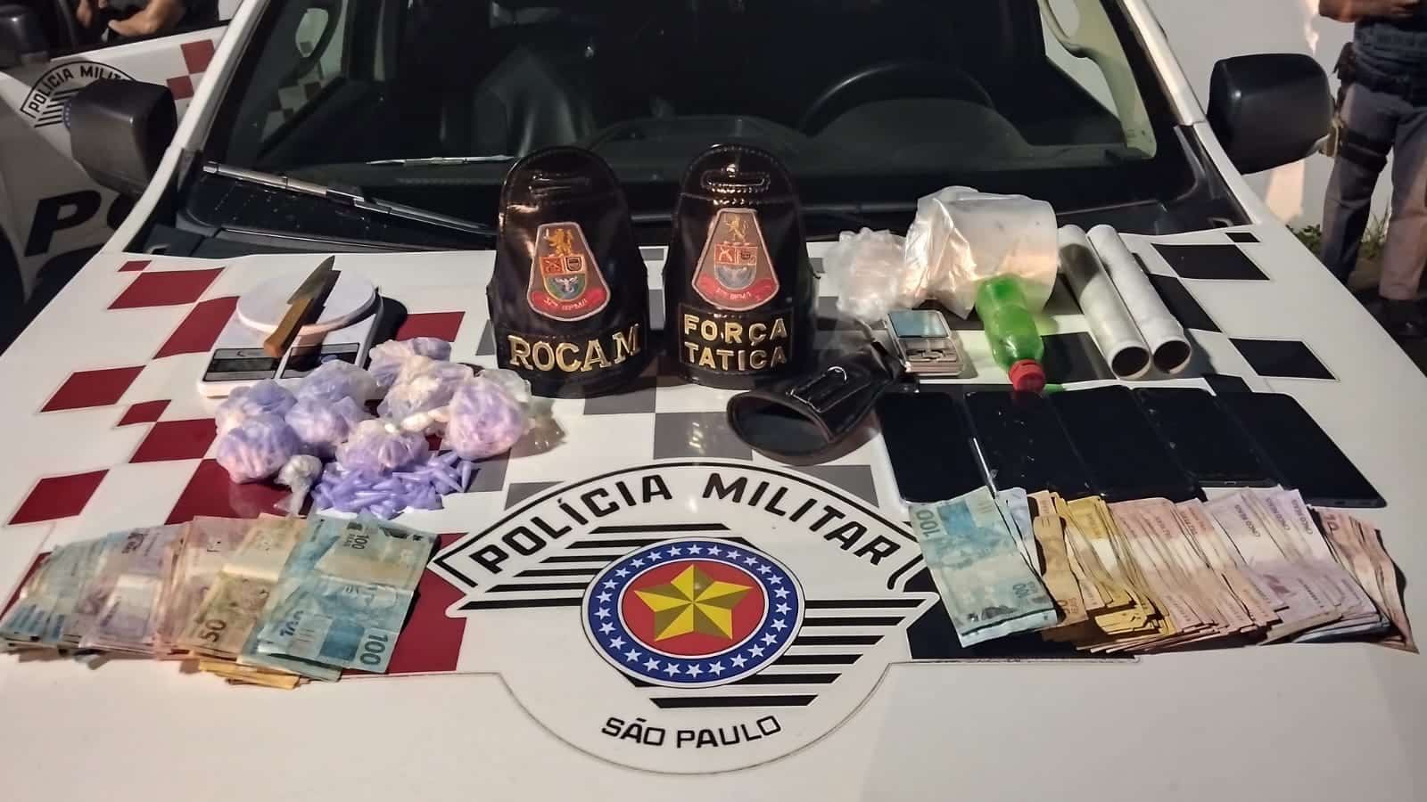 Na garagem haviam mais dois indivíduos esses já conhecidos nos meios policiais por tráfico de drogas. Um deles dispensou uma pequena garrafa plástica contendo entorpecentes sendo apreendidos um total de 307 eppendofs de cocaína, vários apetrechos para embalo de drogas, balanças de precisão e R$ 2.972,00 em cédulas diversas além de cinco aparelhos celulares de marcas diversas.