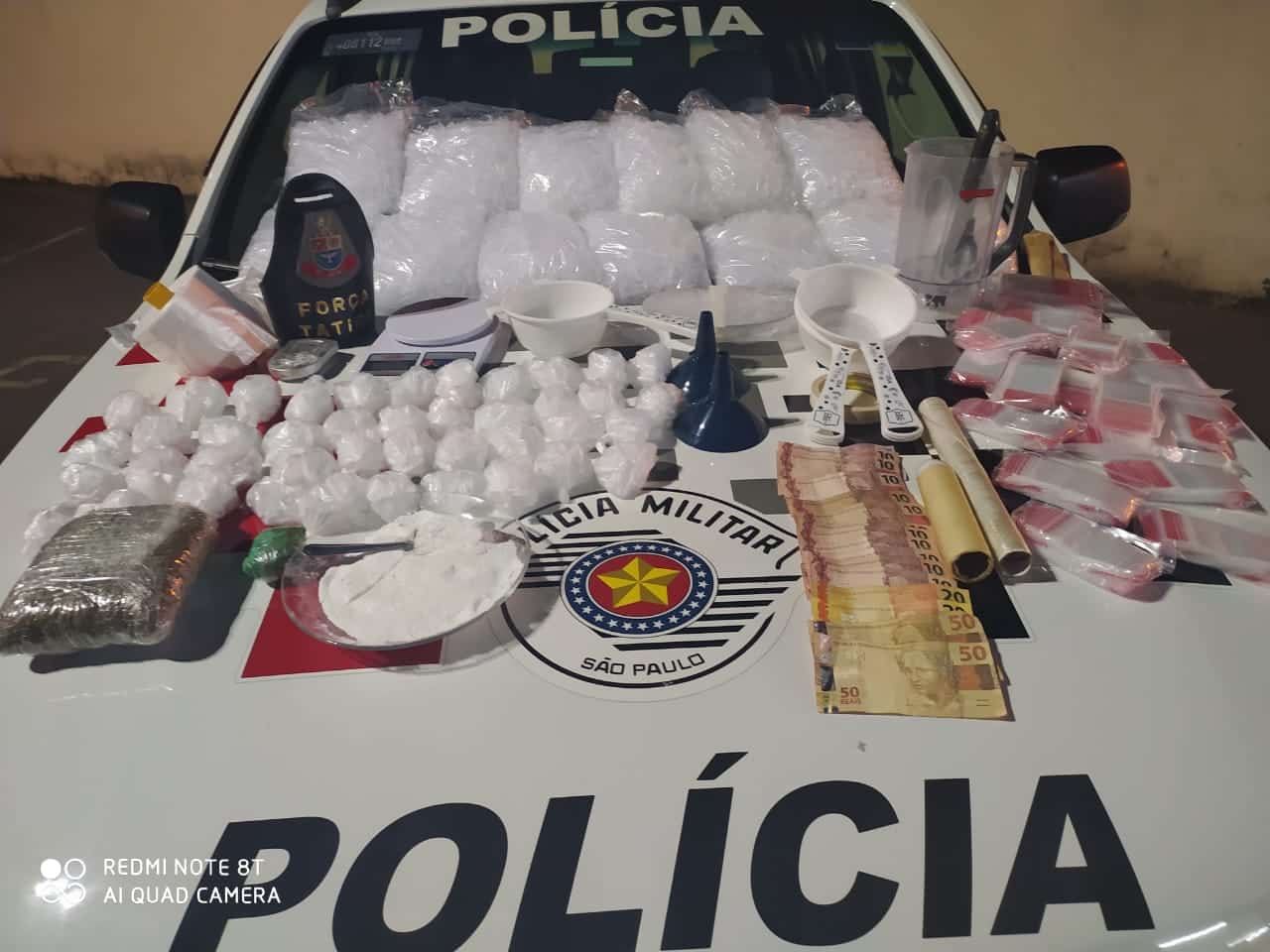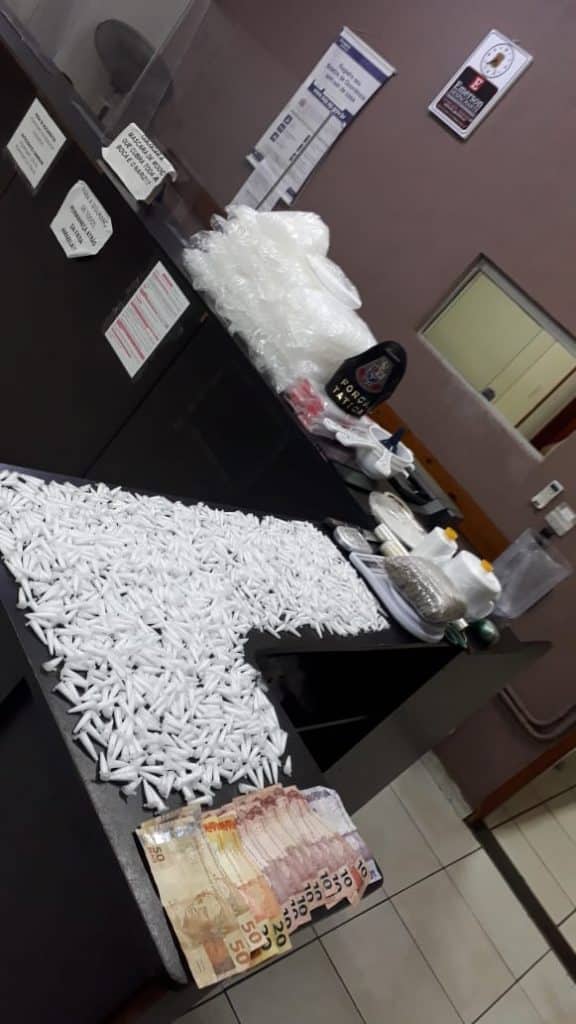 Em revista pessoal constatou-se que o indivíduo estava segurando dois invólucros plásticos contendo 70 cápsulas de cocaína. Durante diligências pelo local foram localizados a quantia de 1.429 eppendorf’s contendo cocaína e 13 mil cápsulas vazias, 190 gramas de cocaína a granel, um tijolo de maconha tipo skank, uma porção 0,500 gramas de maconha, além de balanças de precisão vários apetrechos pra manipulação e embalo das drogas, e o valor de R$ 265,00 em dinheiro.