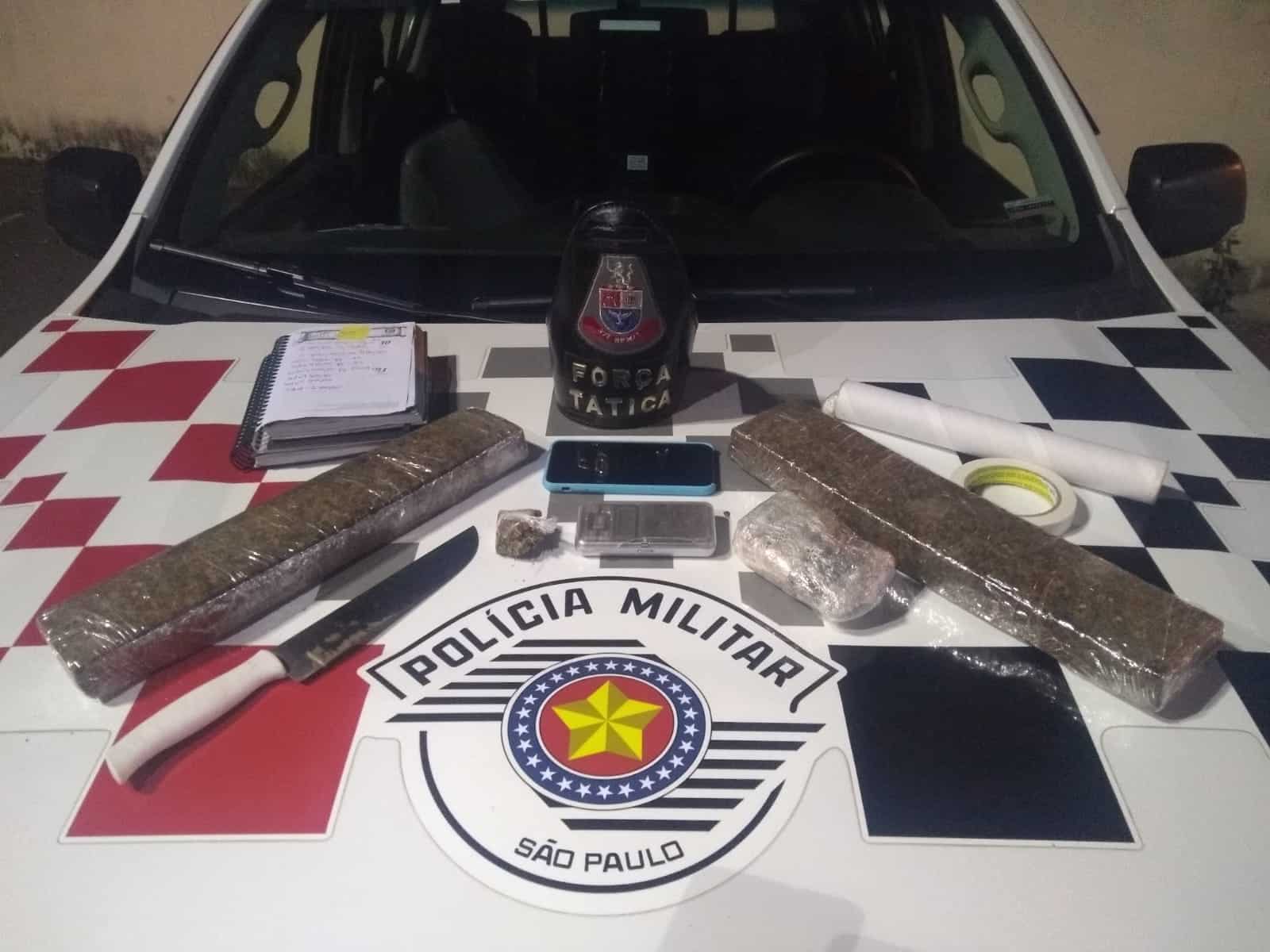Os policiais ficaram notando a movimentação e quando o indivíduo saiu do local foi abordado. Com o apoio de outras viaturas, os PMs tiveram a entrada autorizada na residência e após buscas encontraram um tijolo de maconha. Já no terreno havia mais um tijolo de maconha, duas porções menores, apetrechos para o embalo e duas balanças de precisão.