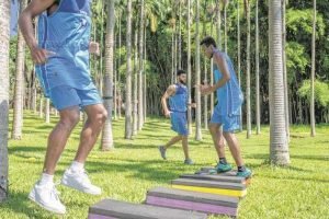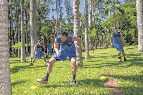 Na Floresta Estadual, os treinos físicos tiveram adaptações e os jogadores foram submetidos a um circuito metabólico; clique para ampliar