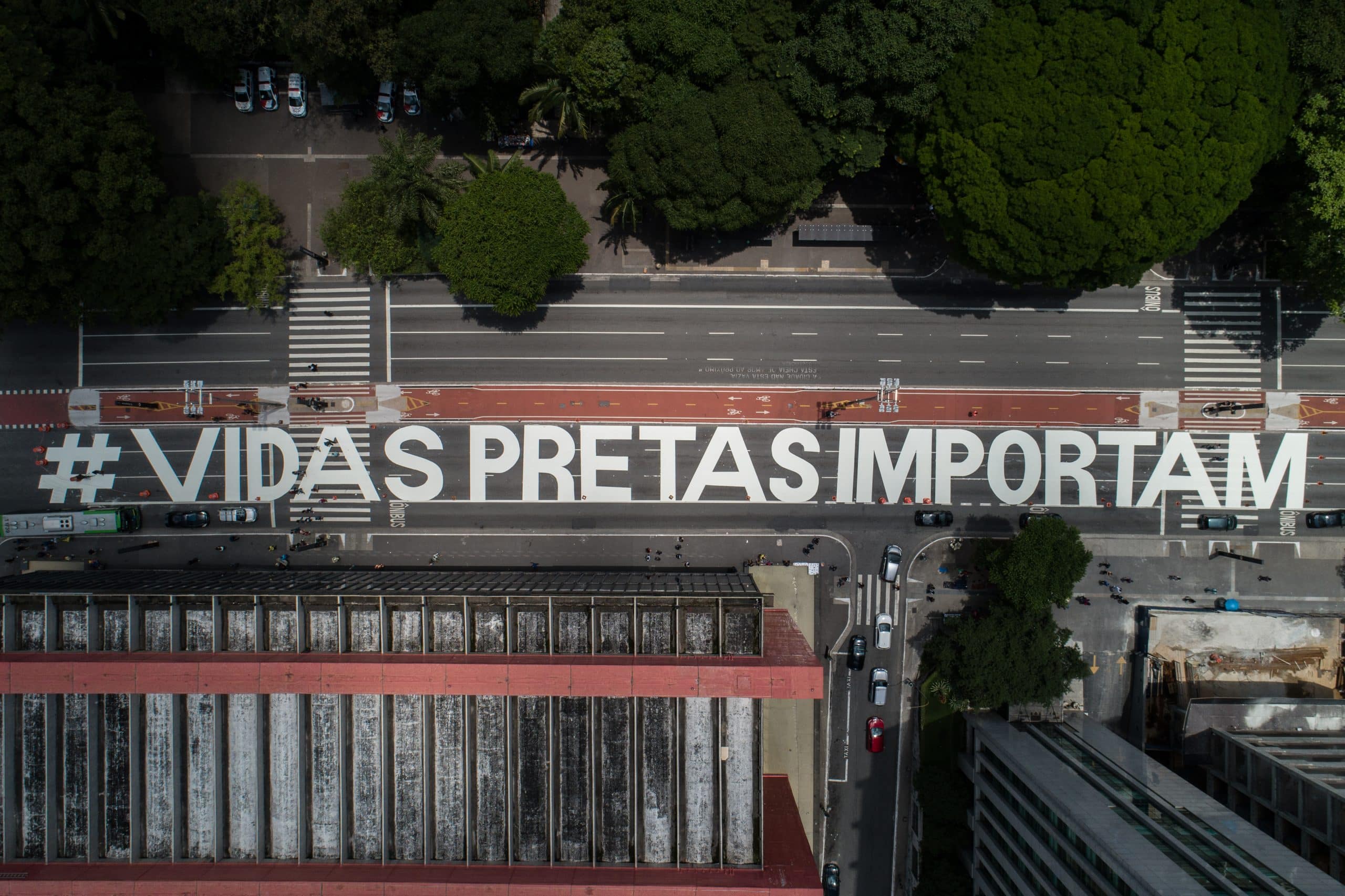 A avenida Paulista amanheceu neste sábado (21) com a frase “Vidas pretas importam” estampada em seu asfalto.