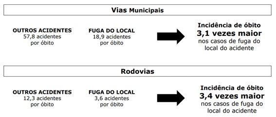 O levantamento do programa Respeito à Vida analisa a letalidade das ocorrências a partir da relação entre acidentes e fatalidades. Em vias urbanas, as estatísticas do Infosiga SP apontam que há 57,8 acidentes para cada óbito. Já nas ocorrências com fuga do condutor, a relação passa para 18,9 acidentes para cada óbito. Ou seja, a incidência de óbito é 3,1 vezes maior quando há evasão do local. A situação é semelhante nas rodovias. A relação passa de 12,3 para 3,6 acidentes por óbito quando há fuga do condutor, índice 3,4 vezes maior.