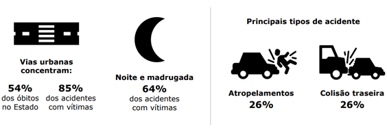 Cerca de 85% dos acidentes com abandono do local pelos condutores ocorreram em vias urbanas, que também abrigam a maior parte das fatalidades (54%). Em 64% dos casos, os acidentes foram no período noturno. Os tipos de acidente mais comuns são os atropelamentos e as colisões traseiras (26% cada).