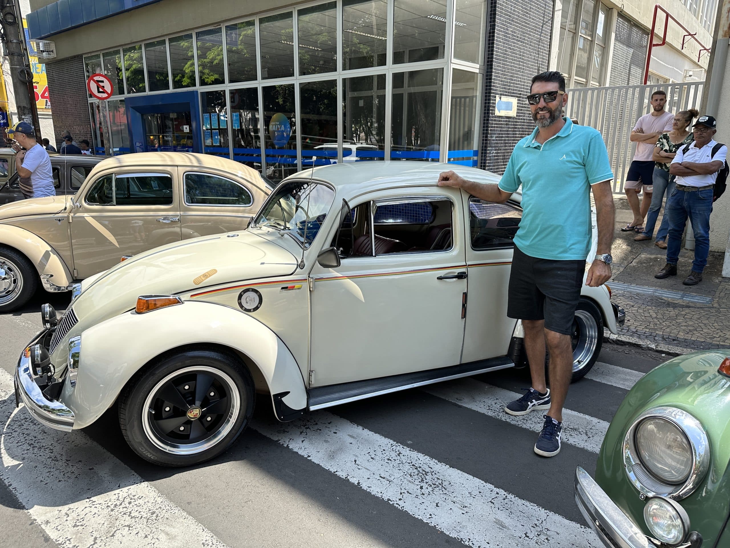 O fusca branco foi comprado em 1974 por Luiz Carlos Godoy, anos depois presenteou o filho Fabrício com o veículo. “Meu pai tirou zero km aqui na concessionária da Volkswagem, quando eu tinha de quatorze para quinze anos, eu passei no Senai daqui de Rio Claro e de presente meu pai deu o carro pra mim, como uma forma de gratidão, e eu tenho o carro até hoje”, relata o comerciante Fabrício Ricardo Godoy.
