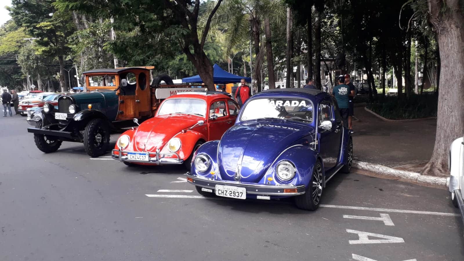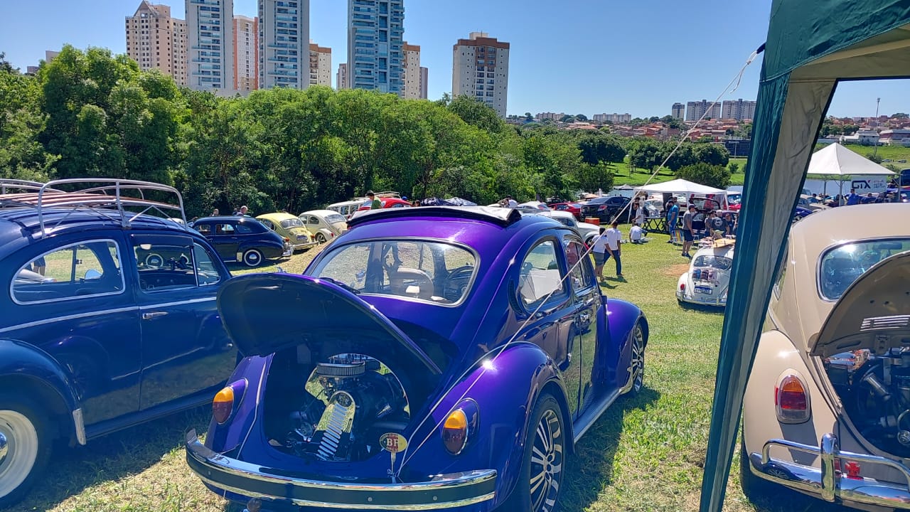 O modelo do Fusca é 75/76, com um motor 1300 ‘melhorado’ e um câmbio modificado, um SP2 mais longo que vale a quinta marcha. Na pista o carro chega a fazer 14,5 km/l na gasolina, o pneu é aro 17 e a aparência de rebaixado na verdade é o diâmetro da roda, que é grande. Tem seis faróis de milha, várias funções no painel, acessórios de época como calha nas portas, par de defletores de quebra-vidro e diversos adesivos pela lataria, todos têm história.