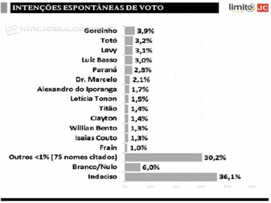 Pelos entrevistados são citados outros 75 nomes, todos com menos de 1%. Brancos ou nulos representam 6% e 36,1% dos entrevistados se declararam indecisos. Quase todos os vereadores que atualmente ocupam as cadeiras do Legislativo figuram entre os candidatos com maior intenção de voto, apenas José Luiz “Ratinho” (PMDB) aparece abaixo de 1%. Os demais são Glalson Chamon que concorre como vice-prefeito e Valério Joaquim Gaioto que não se candidatou.