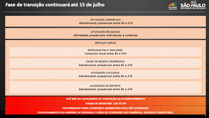 A última atualização do Plano SP previa a manutenção da fase de transição até 30 de junho. Com a nova prorrogação, as normas passam a valer até a primeira quinzena de julho. As regras para funcionamento das atividades econômicas permanecem as mesmas: os estabelecimentos podem funcionar das 6h às 21 horas com no máximo de 40% de ocupação.