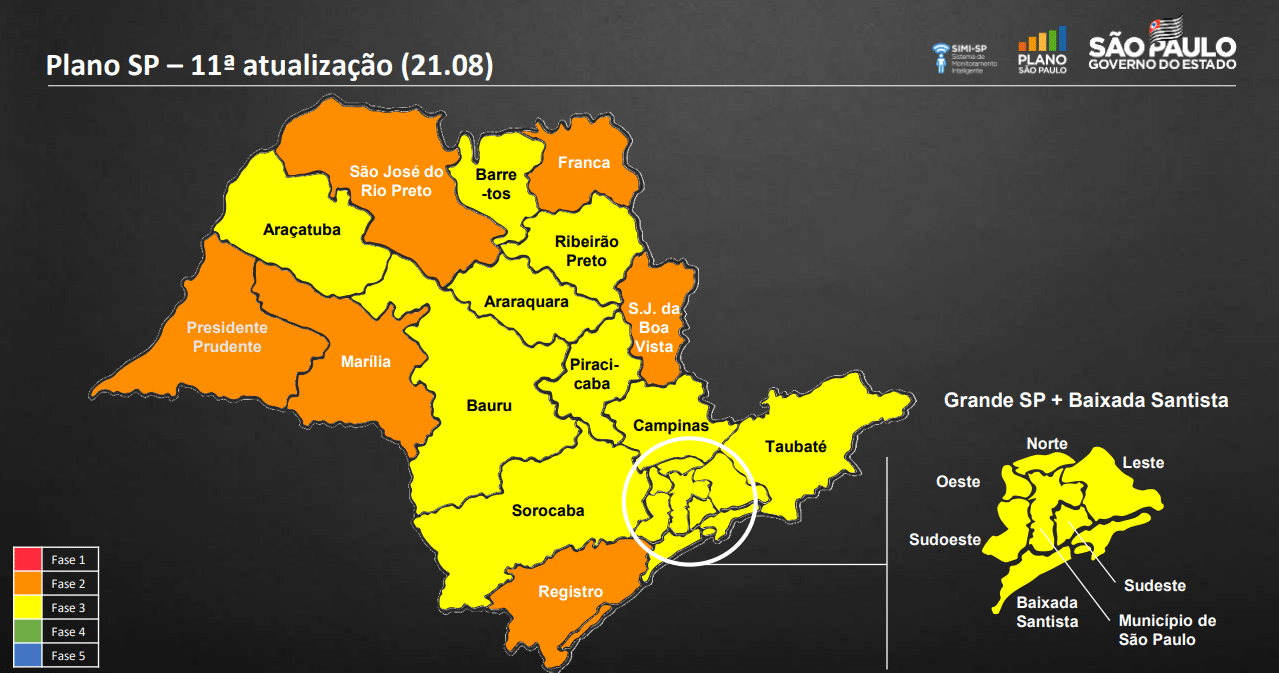 É a 11ª atualização programada do Plano São Paulo, em vigor desde o início de junho. Houve cinco progressões para fases de menor restrição à atividade econômica e mobilidade social. As áreas dos DRSs (Departamentos Regionais de Saúde) de Franca e Registro, que estavam na etapa vermelha, avançaram para a fase laranja. Já as sub-regiões Norte e Oeste da Grande São Paulo e a região do Barretos passaram da etapa laranja para a amarela.