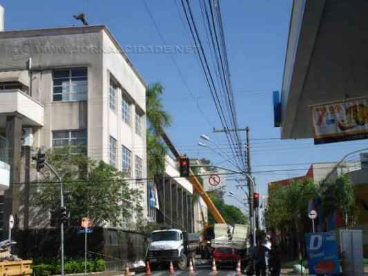 Um enorme guindaste chama a atenção de quem passa pela região central. De longe é possível observar a máquina, usada para o transporte de telhas até a Câmara Municipal, localizada no terceiro andar do Paço Municipal.