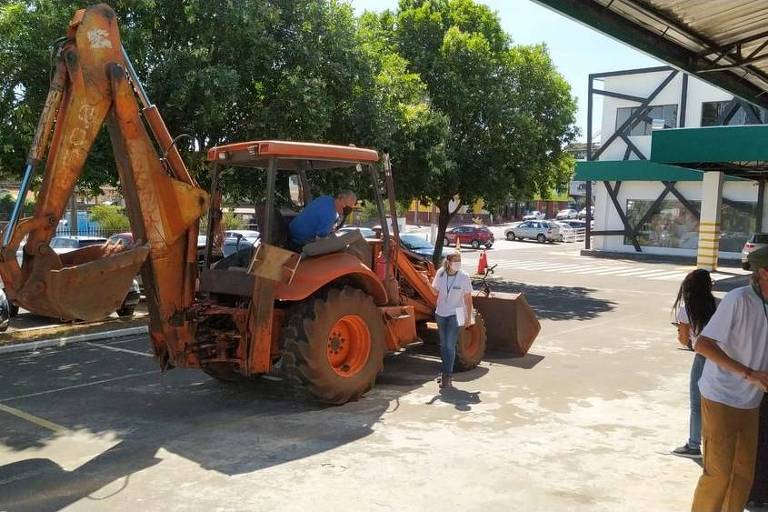 Apesar do veículo incomum, José de Almeida Filho, 68, foi devidamente imunizado com a primeira dose da Coronavac. Conhecido como Zezinho e Zé da Terra, ele diz usar a máquina não só para trabalhos de limpeza e de terraplanagem, mas também no dia a dia, como em idas ao supermercado.
