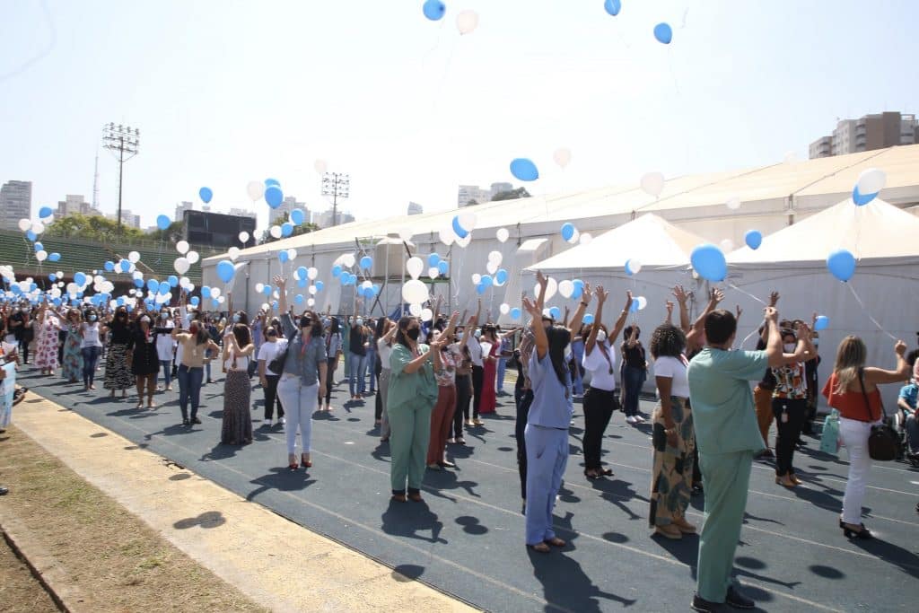 Cada profissional que atuou no local saiu da estrutura hospitalar com uma medalha, com a frase “Você fez a diferença. Nossa força vem da união”, carregando 500 balões nas cores azul e branca. As bexigas foram lançadas ao ar para representar e homenagear todas as 2,4 mil vidas salvas no hospital.
