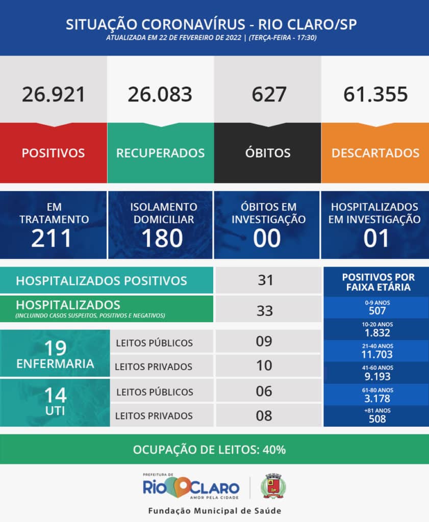 Com a morte de uma idosa, Rio Claro chegou a 627 óbitos nesta pandemia de Covid. A Fundação Municipal de Saúde divulgou boletim na tarde desta terça-feira (22) que também registra 53 novos casos da doença e 60 pessoas recuperadas, totalizando 26.921 casos positivos e 26.083 recuperados.