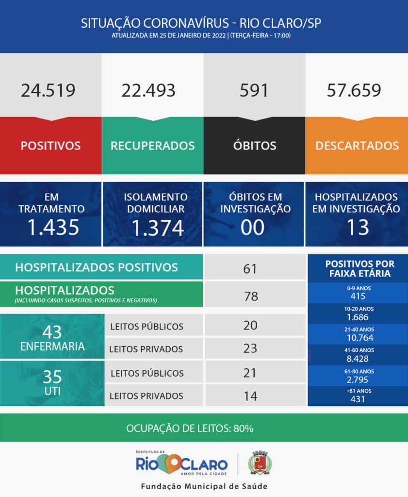 Com a morte de uma idosa, Rio Claro totaliza agora 591 óbitos nesta pandemia de Covid. O município registrou mais 410 casos de infecção pelo coronavírus e passou a ter 78 pessoas hospitalizadas, sendo 35 em unidades de terapia intensiva. A ocupação de leitos está em 80%.