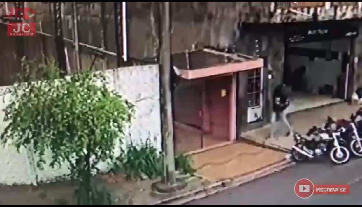 Um homem invadiu na tarde desta segunda-feira (05) uma oficina de conserto de motos no Jardim Claret. As imagens registradas por câmeras de segurança mostram que o ladrão primeiro passa pela rua 18 e somente observa a movimentação.