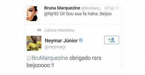 Agora, internautas recuperaram o que pode ter sido a primeira interação entre os dois, lá em 2011. Em um tuíte já deletado, Bruna Marquezine teria mandado um “Oi! Sou sua fã haha. Beijoo” e o jogador retribuiu com um “Obrigado rs rs beijoooo !!”. “Onde tudo começou”, comentou uma fã no tuíte do jogador, que ainda está disponível na página de Neymar.