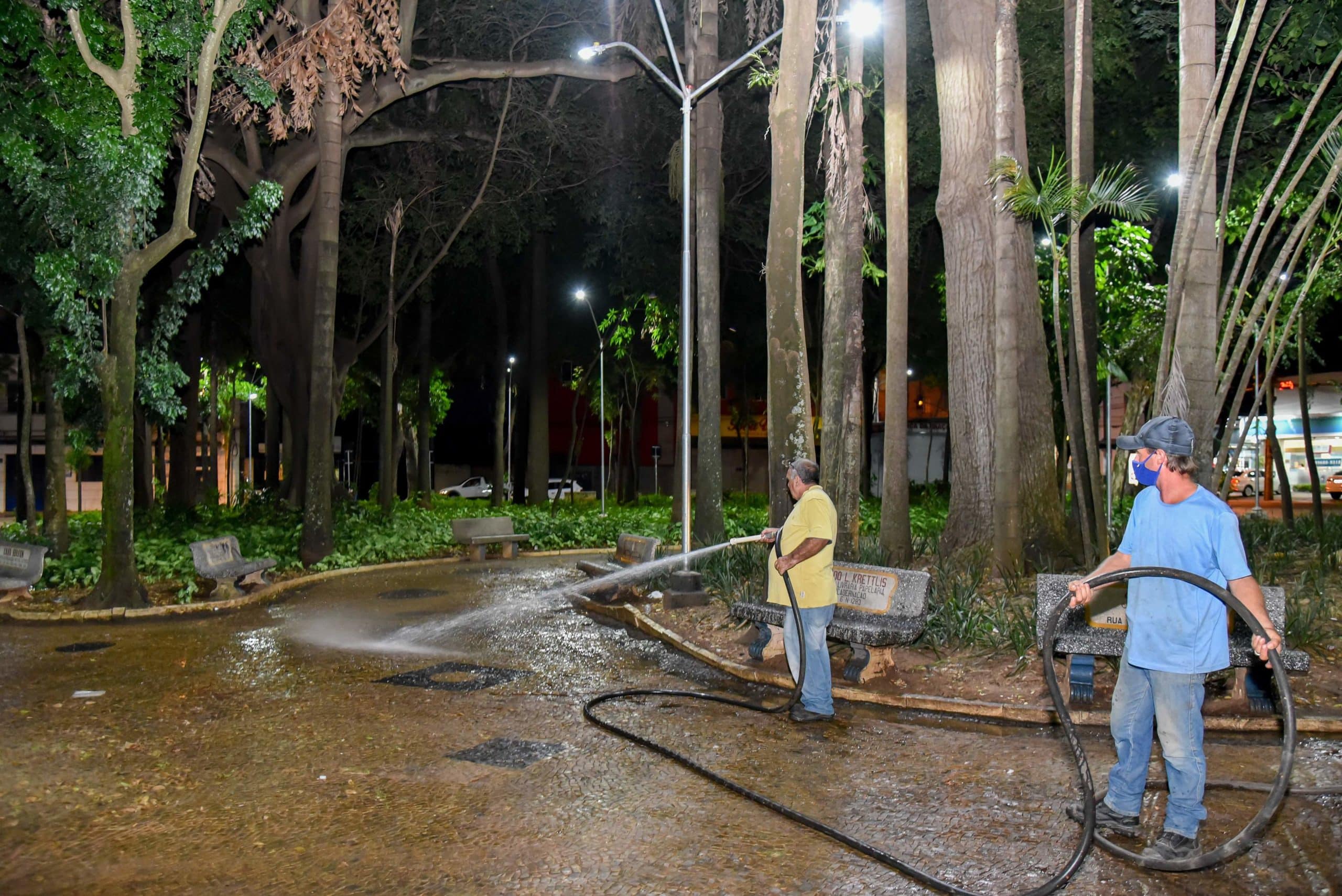 Duas noites por semana, equipes de limpeza lavam toda a praça, que ocupa dois quarteirões entre as ruas 3 e 4 e avenidas 1 e 3. O serviço é feito às terças e sextas-feiras, no período noturno, quando a circulação de pessoas é menor, já que durante o dia milhares passam por ali.