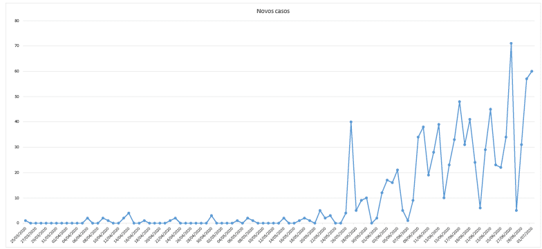 Do primeiro boletim até 5 de abril, o município tinha apenas um morador infectado pelo novo coronavírus, número que triplicou em 6 de abril, com três casos. Um mês após a primeira divulgação do levantamento, eram 16 pessoas com a doença.