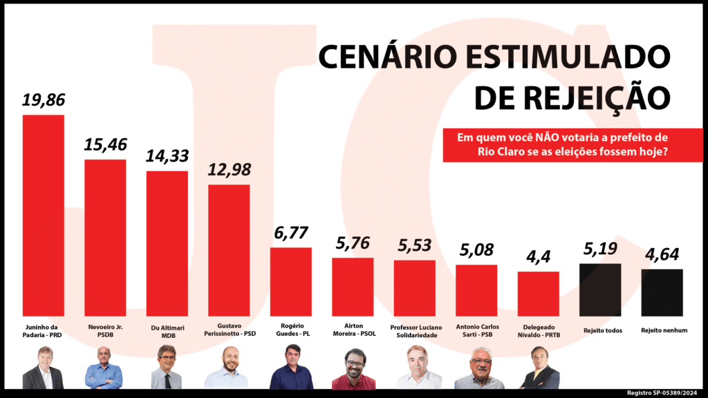 O ex-prefeito João Teixeira Junior, o Juninho da Padaria, aparece com o maior índice de rejeição na pesquisa estimulada de voto a prefeito de Rio Claro nas eleições de 2024 do JC/Statsol. A pergunta “Em que você não votaria a prefeito de Rio Claro se as eleições fossem hoje?” foi realizada com os mesmos nove pré-candidatos a prefeito citados na pesquisa de intenção de voto divulgada no último domingo (19) nas páginas da edição impressa do JC e está disponível na íntegra aqui.